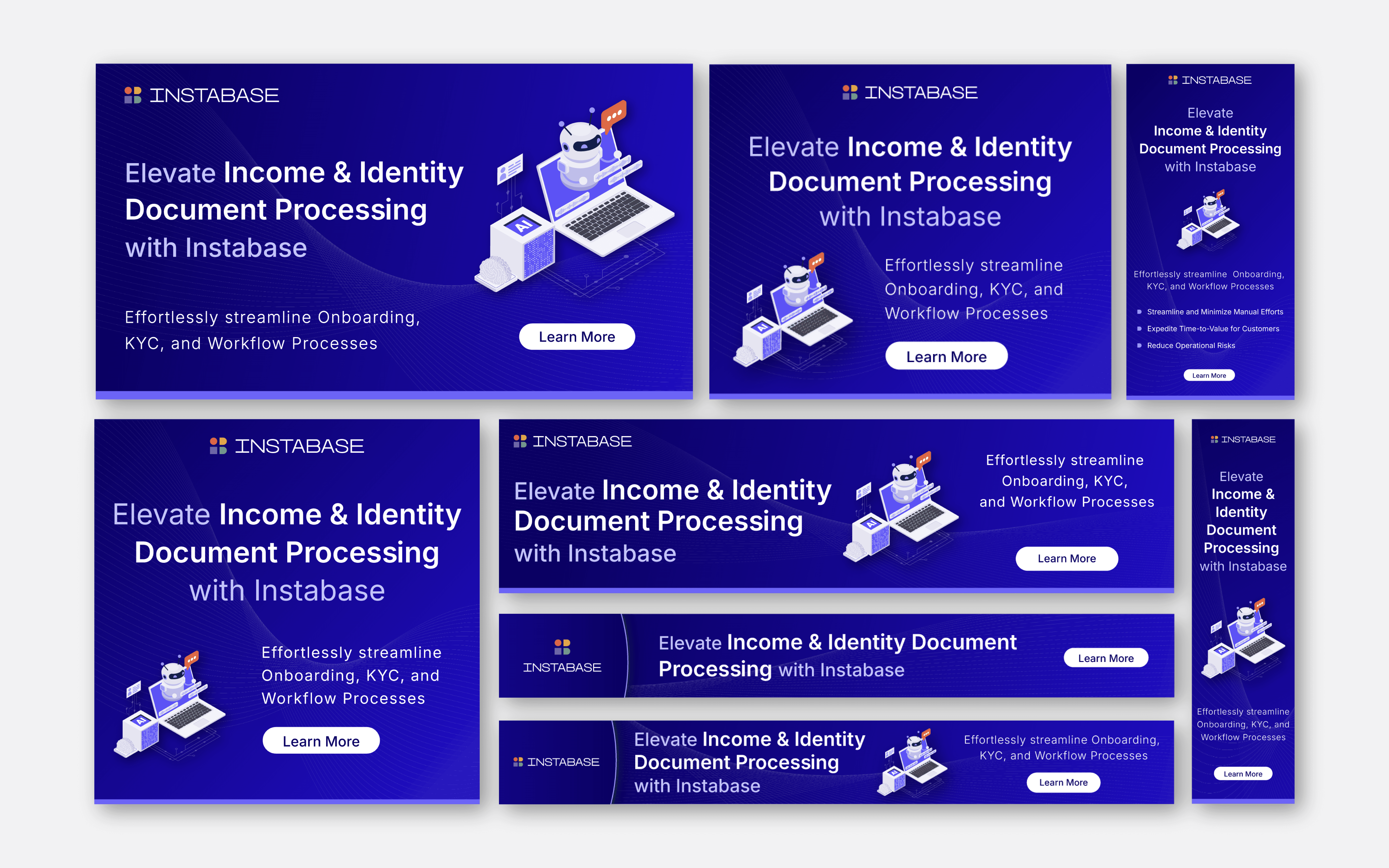 adapting to the constraints of each channel — what works at 1920×1080 reads very differently at 300×250. Each execution was designed to feel native to its placement while remaining unmistakably Instabase.