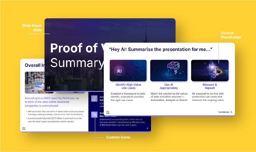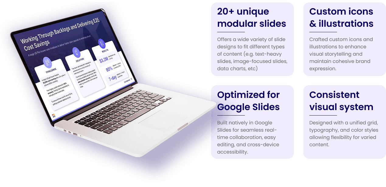 and cohesive layout. Custom icons were developed to support visual storytelling, maintain brand consistency, and improve content clarity across various use cases—from marketing presentations to internal strategy decks.